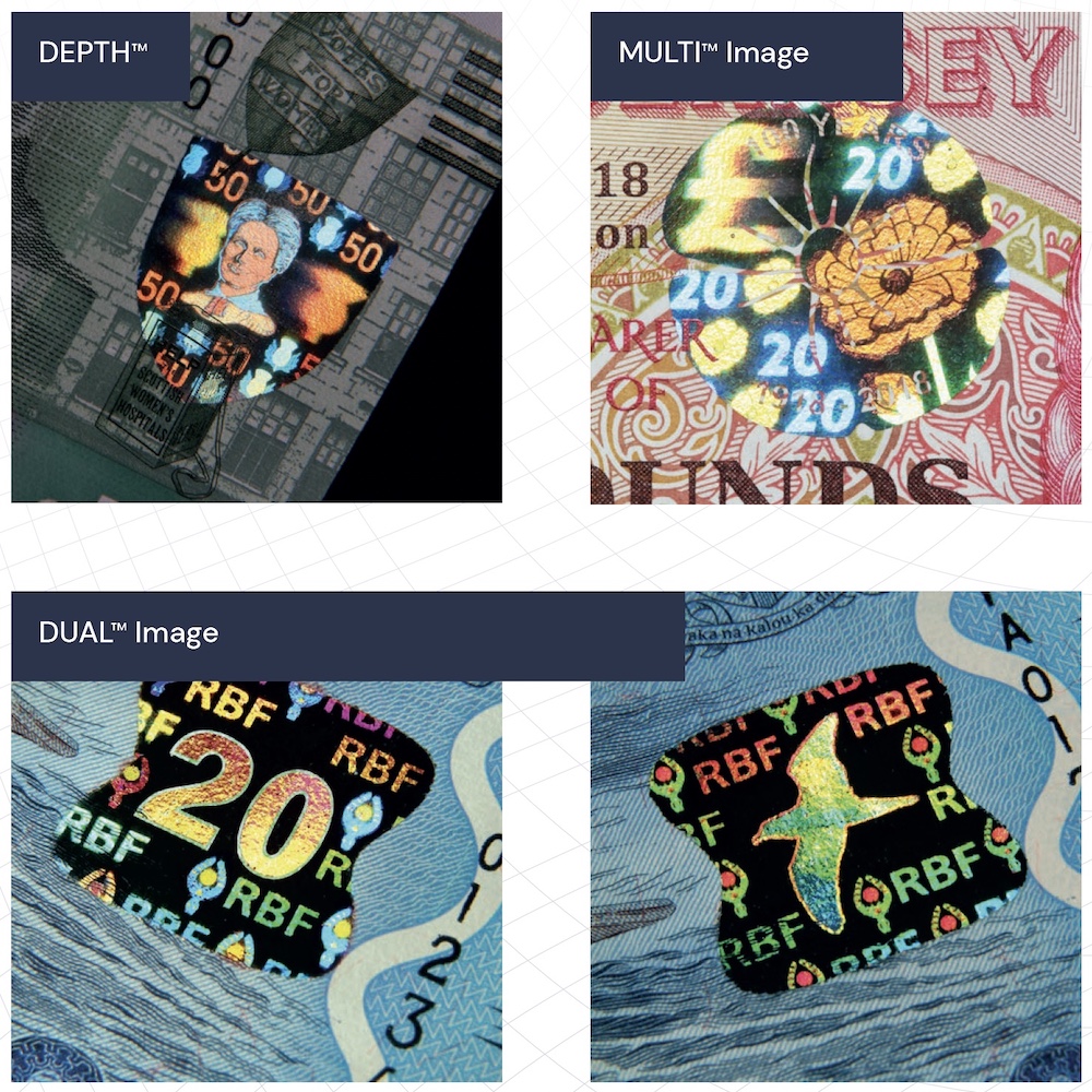 These three effects form part of De La Rue's classical and digital holographic origination portfolio, applied to holographic patches and stripes on banknotes. They can be used individually or in combination to create layered, multi-dimensional authentication features.