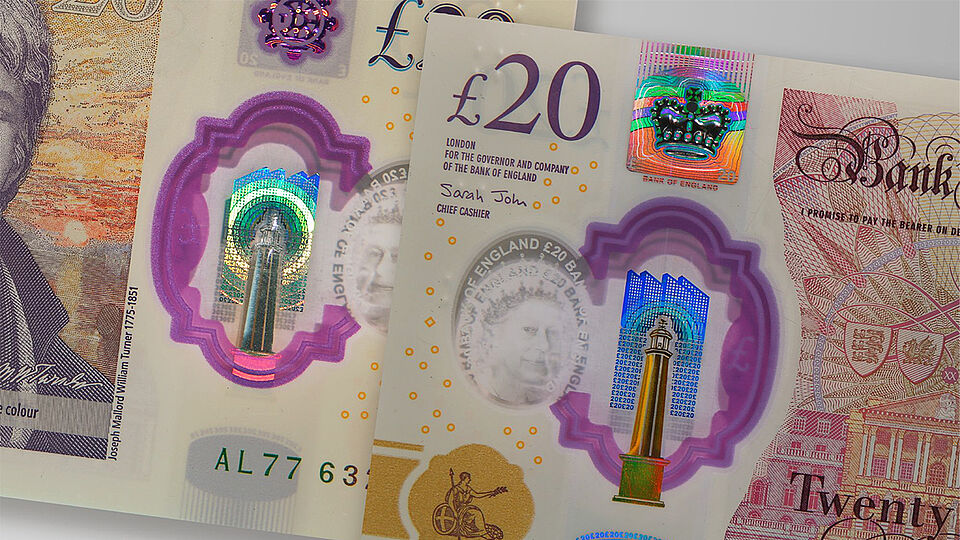 The technology creates striking color shifts and dynamic movement effects when the banknote is tilted, displaying brilliant, saturated colors that change and flow across the security element. Unlike simpler color-shifting features, KINEGRAM COLORS® produces complex, multi-dimensional visual displays with sharp color transitions and depth effects that engage both the public and trained cash handlers.
